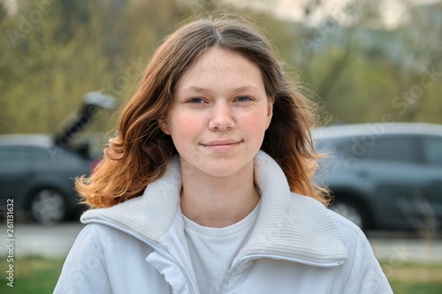 Outdoor Portrait Of Teenager Girl 15 Years Old Girl Smiling With Long Brown Hair In White Jacket Stock Photo Adobe Stock